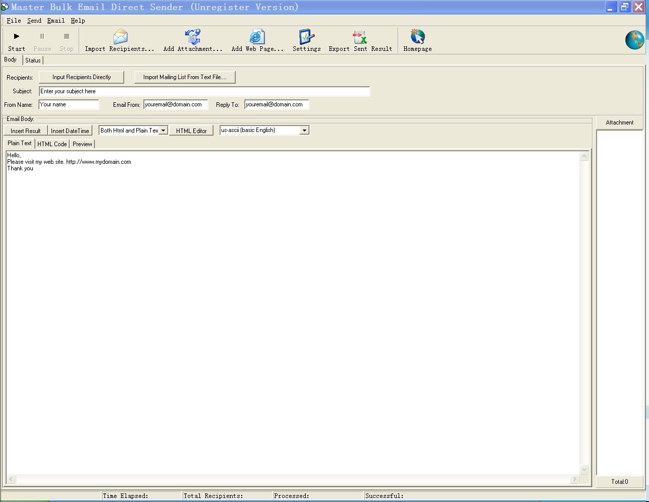 Master Bulk Email Direct Sender is a perfect high speed bulk email direct sender. It works like a mail server, you don't need to enter SMTP server, it sends mail to recipients' mail server. As a multi-threaded application, Master Bulk Email Direct Sender's normal sending speed can up to 50,000 e-mails per hour. It also has a professional and simple user interface so that everyone can master it up in few minutes. It can also remove duplicate email addresses while sending.